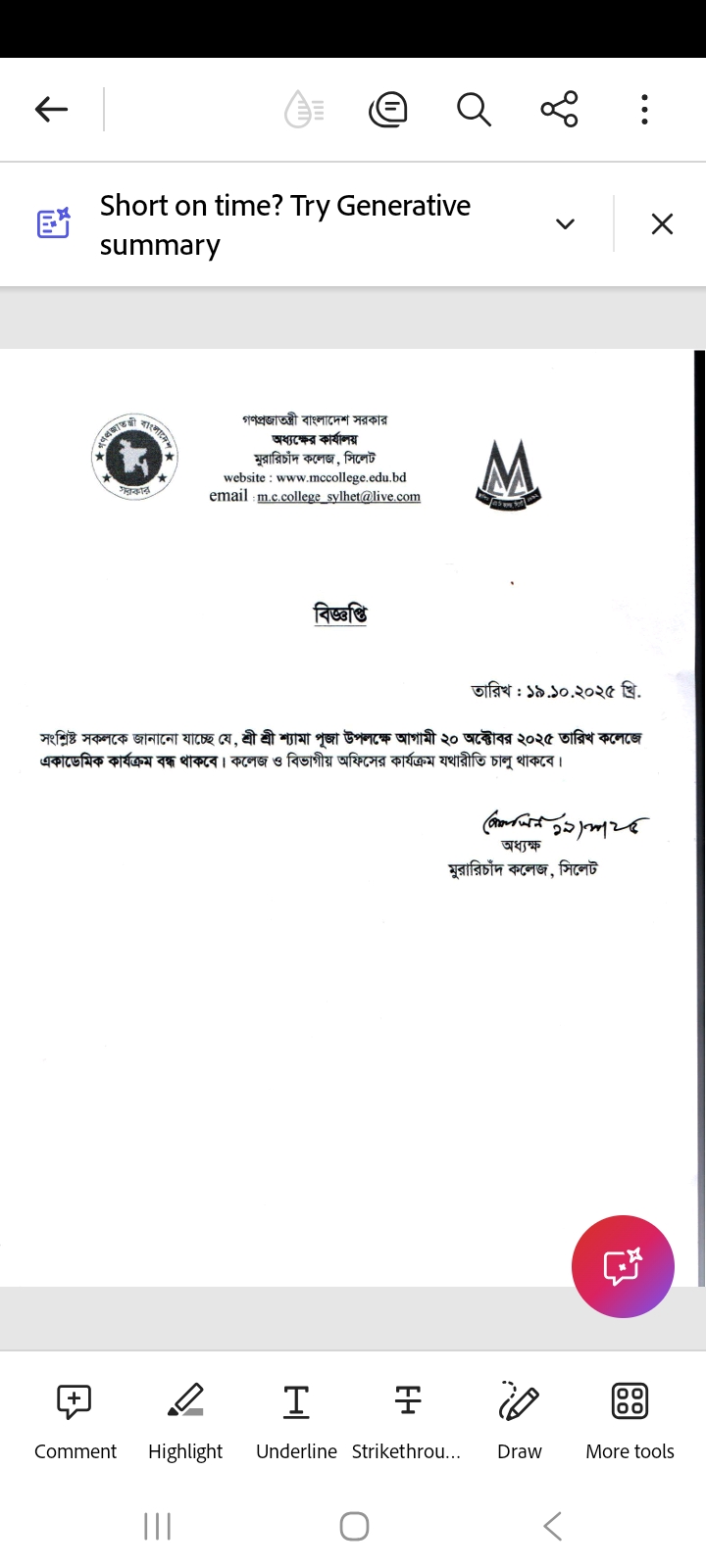শ্রী শ্রী শ্যামা পূজা উপলক্ষে ক্লাস বন্ধের নোটিশ