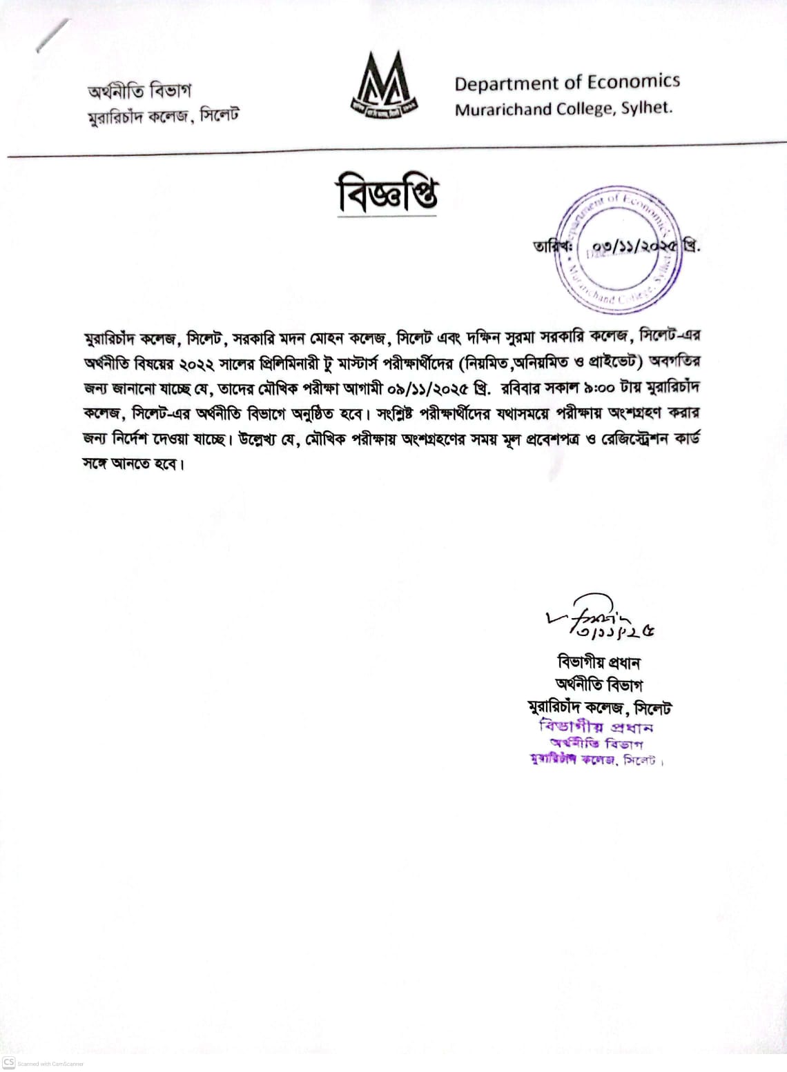 ২০২২ সালের প্রিলিমিনারী টু মাস্টার্স অর্থনীতি বিষয়ের ভাইভা বিজ্ঞপ্তি