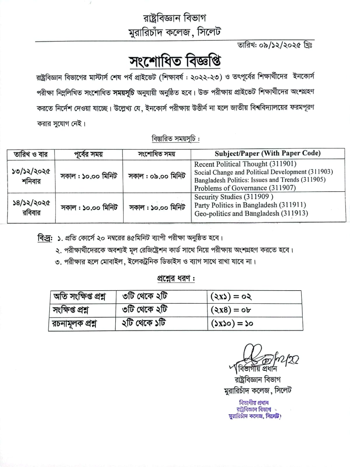২০২২-২৩ শিক্ষাবর্ষের মাস্টার্স শেষপর্ব রাষ্ট্রবিজ্ঞান বিষয়ের প্রাইভেট শিক্ষার্থীদের ইনকোর্স পরীক্ষার সময়সূচি