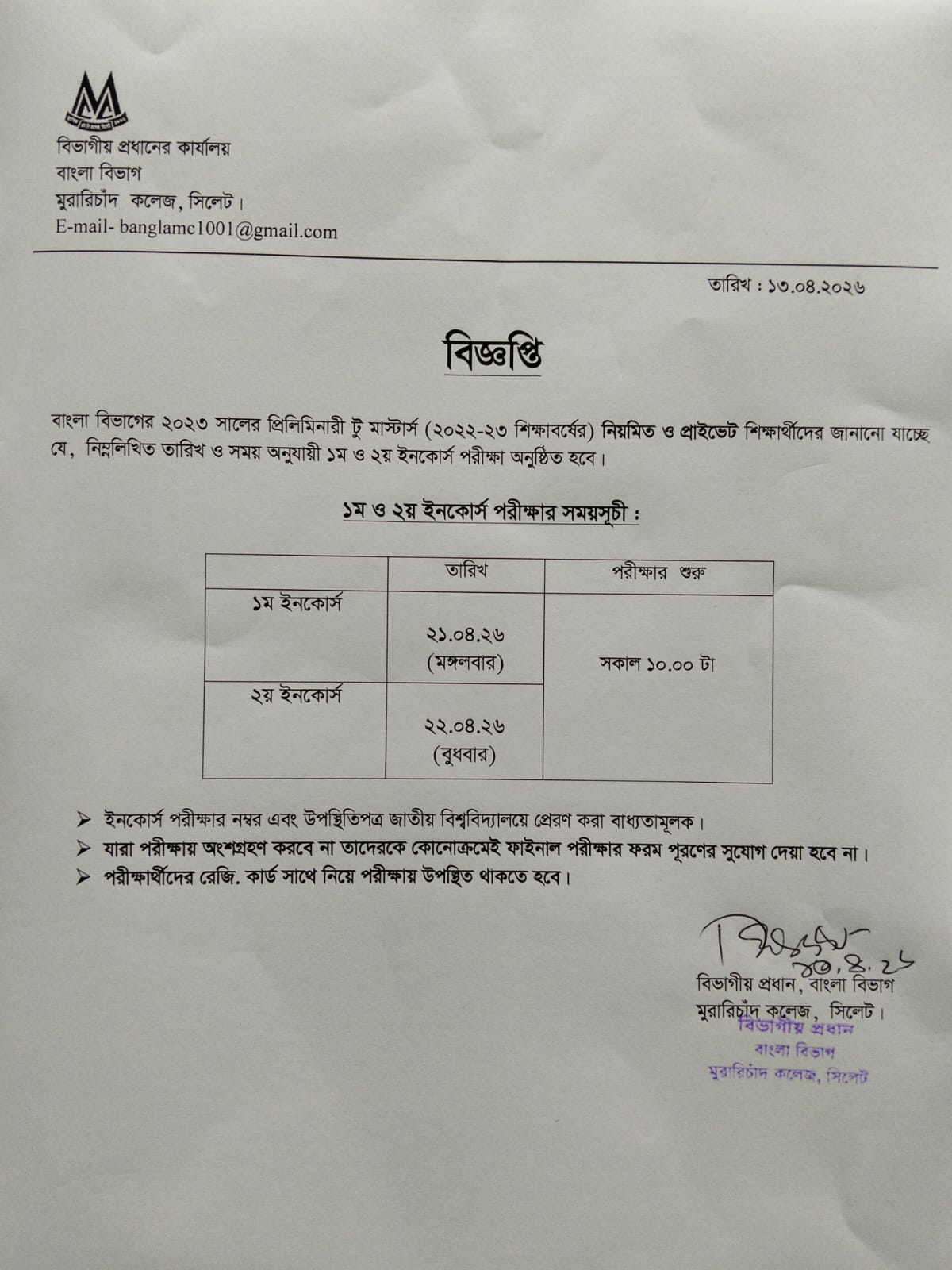 ২০২৩ সালের প্রিলিমিনারী টু মাস্টার্স এর বাংলা বিষয়ের ইনকোর্স পরীক্ষার সময়সূচি